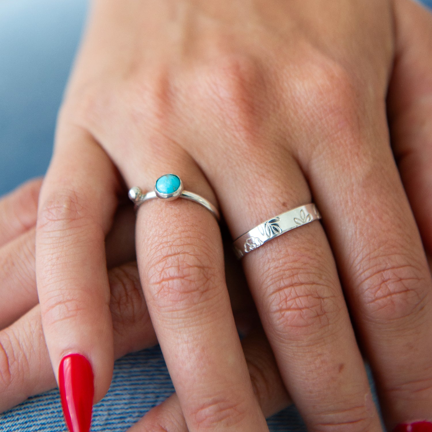 Embrace the beauty of nature with the Blossom Ring Band. This handcrafted piece features a thick band delicately stamped with floral motifs. Available in both sterling silver and 14k gold filled, this versatile ring can be worn alone or layered with your favorite pieces. Let the spirit of spring bloom on your finger.
