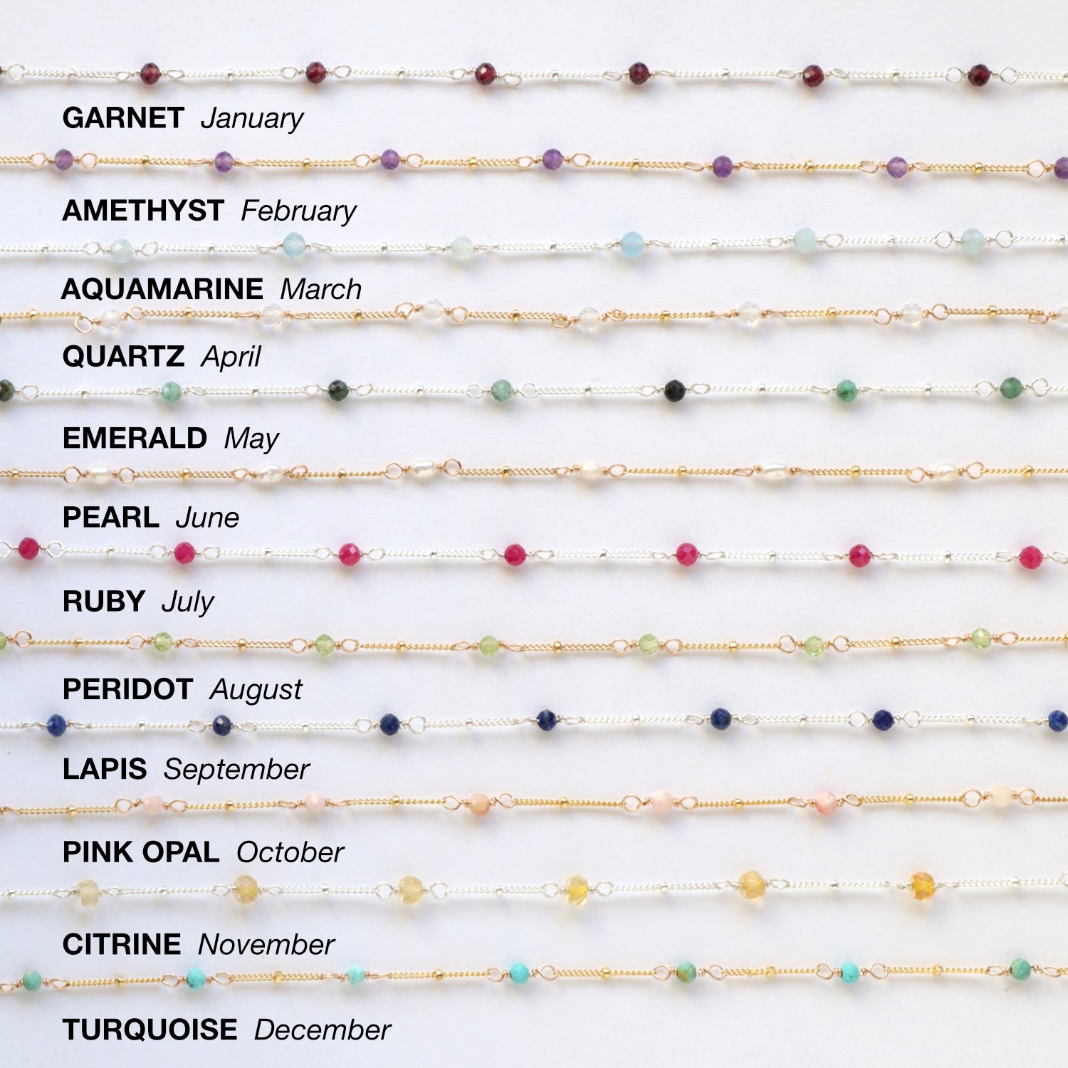 Garnet/January, Amethyst/February, Aquamarine/March, Quartz/April, Emerald/May, Pearl/June, Ruby/July, Peridot/August, Lapis/September, Pink Opal/October, Citrine/November, and Turquoise/December.