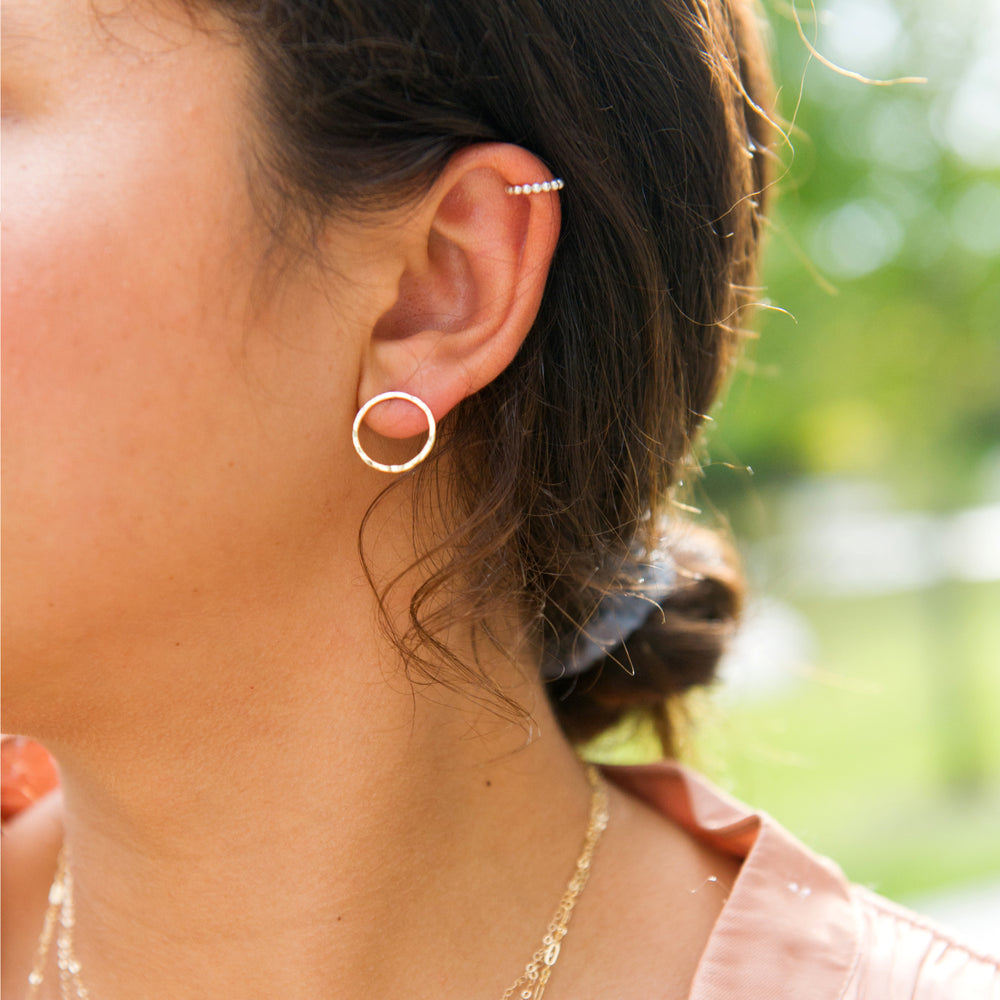 Experience the captivating allure of these open circle stud earrings, where the textured beauty of hammered metal adds an expressive and fluid dimension. Embrace the unique charm and dynamic appeal that these stud earrings bring to your ensemble.