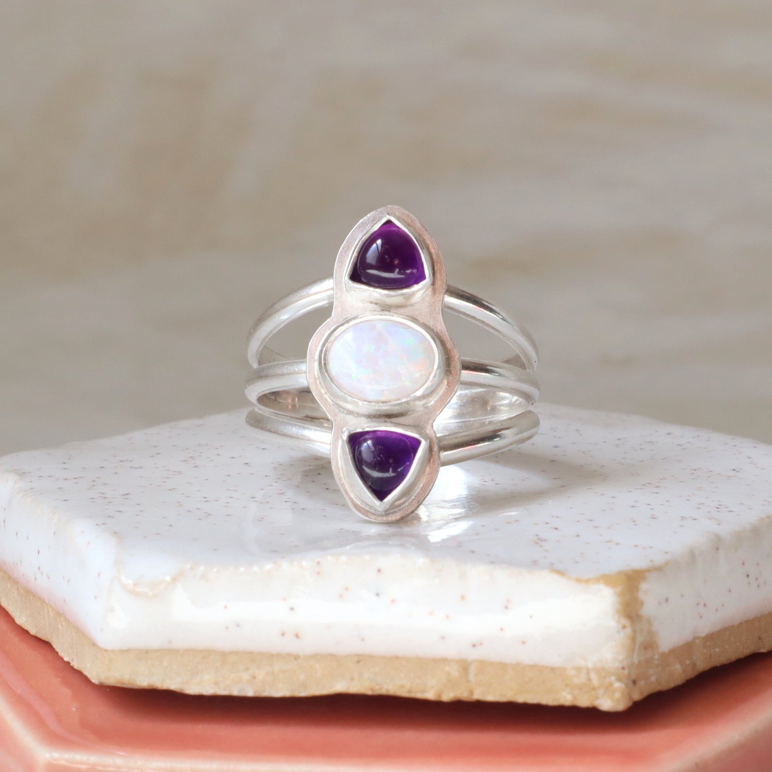 A soft shimmer of twilight captured in gemstone form — the Evening Glow Ring features two delicate triangle-cut amethysts framing a glowing oval opal at the center. The combination radiates a gentle balance of color and light, like the moment the sun dips below the horizon.